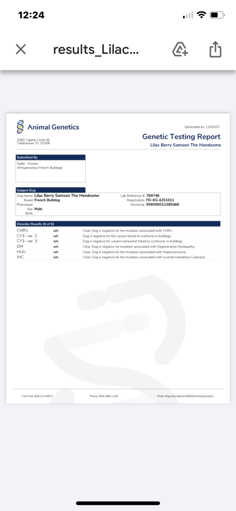 DNA: at Dd Bb Coco Ee – No brindle. No pied. Frenchie panel clear. C3 clear.